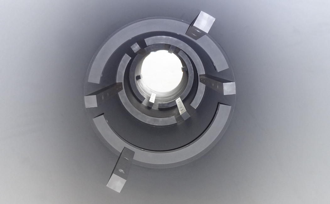 CIP成型したカーボン塊を切削加工後、連結して1本のレトルトとしています。内部のリフターや堰板はカーボンボルトで締結します。金属外筒の2重構造となります。