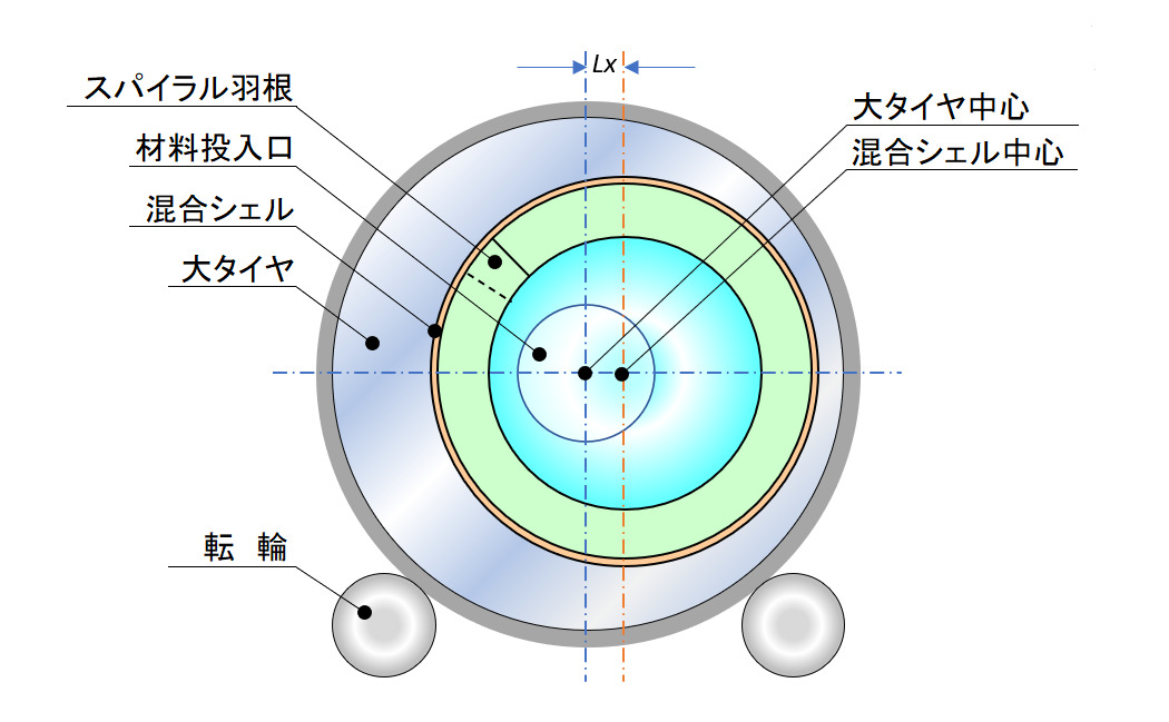 【シェル偏心】 転輪上で回転する大タイヤ中心と、大タイヤに連結された混合シェル中心は距離Lxで偏心しています。大タイヤが回転すると混合シェルは偏心回転を行い、材料挙動を活性化させます。材料の投入口と排出口は大タイヤ中心に配置されているので、シュートの連結が可能です。